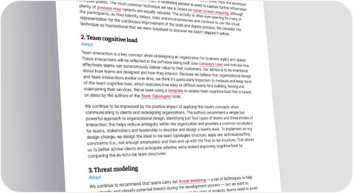 Techniques Thoughtworks Technology Radar 1. Path-to-production mapping Adopt Although path-to-production mapping has been a near-universal practice at Thoughtworks since codifying Continuous Delivery, we often come across organizations unfamiliar with the practice. The activity is most often done in a workshop with a cross-functional group of people — that includes everyone involved in designing, developing, releasing and operating the software — around a shared whiteboard (or virtual equivalent). First, the steps in the process are listed in order, from the developer workstation all the way to production. Then, a facilitated session is used to capture further information and pain points. The most common technique we see is based on value-stream mapping, although plenty of process map variants are equally valuable. The activity is often eye-opening for many of the participants, as they identify delays, risks and inconsistencies and continue to use the visual representation for the continuous improvement of the build and deploy process. We consider this technique so foundational that we were surprised to discover we hadn’t blipped it before. 2. Team cognitive load Adopt Team interaction is a key concept when redesigning an organization for business agility and speed. These interactions will be reflected in the software being built (see Conway’s Law) and indicate how effectively teams can autonomously deliver value to their customers. Our advice is to be intentional about how teams are designed and how they interact. Because we believe that organizational design and team interactions evolve over time, we think it’s particularly important to measure and keep track of the team cognitive load, which indicates how easy or difficult teams find building, testing and maintaining their services. We’ve been using a template to assess team cognitive load that is based on ideas by the authors of the Team Topologies book. We continue to be impressed by the positive impact of applying this book’s concepts when communicating to clients and redesigning organizations. The authors recommend a simple but powerful approach to organizational design, identifying just four types of teams and three modes of interaction; this helps reduce ambiguity within the organization and provides a common vocabulary for teams, stakeholders and leadership to describe and design a team’s work. To implement an org design change, we design the ideal to-be team topologies structure, apply any technical/staffing constraints (i.e., not enough employees) and then end up with the final to-be structure. That allows us to better advise clients and anticipate whether we’re indeed improving cognitive load by comparing the as-is/to-be team structures. 3. Threat modeling Adopt We continue to recommend that teams carry out threat modeling — a set of techniques to help you identify and classify potential threats during the development process — but we want to emphasize that this is not a one-off activity only done at the start of projects; teams need to avoid the security sandwich. This is because throughout the lifetime of any software, new threats will emerge and existing ones will continue to evolve thanks to external events and ongoing changes to requirements and architecture. This means that threat modeling needs to be repeated periodically — the frequency of repetition will depend on the circumstances and will need to consider factors such as the cost of running the exercise and the potential risk to the business. When used in conjunction with other techniques, such as establishing cross-functional security requirements to address common risks in the project’s technologies and using automated security scanners, threat modeling can be a powerful asset. © Thoughtworks, Inc. All Rights Reserved. 12