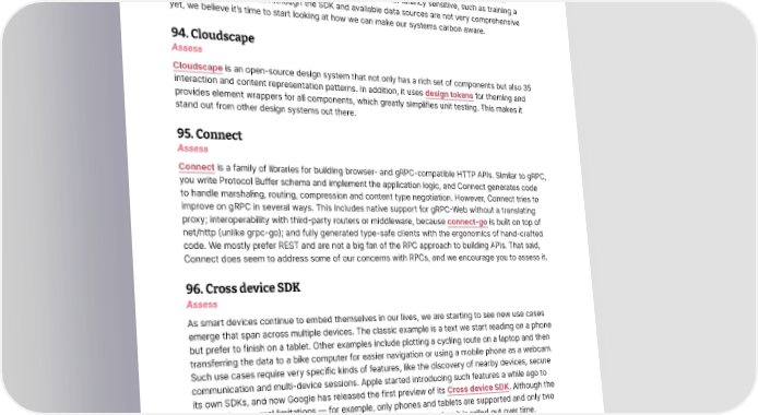 Languages and Frameworks Thoughtworks Technology Radar reducing the emissions from electricity generation and manufacturing of the servers. An additional strategy is to make the application carbon aware. This is because the same workload does not always have the same carbon footprint. For example, when run in a data center in a cooler climate, less power for air conditioning is needed; or, when run at a time when more renewable energy is available (more sunshine, stronger winds), less electricity from carbon-based sources is required. With the Carbon Aware SDK, software engineers can query data sources to discover less carbon-intensive options for a given workload and then move it to a different location or run it at a different time. This makes sense for large workloads that are neither time nor latency sensitive, such as training a machine-learning model. Although the SDK and available data sources are not very comprehensive yet, we believe it’s time to start looking at how we can make our systems carbon aware. 94. Cloudscape Assess Cloudscape is an open-source design system that not only has a rich set of components but also 35 interaction and content representation patterns. In addition, it uses design tokens for theming and provides element wrappers for all components, which greatly simplifies unit testing. This makes it stand out from other design systems out there. 95. Connect Assess Connect is a family of libraries for building browser- and gRPC-compatible HTTP APIs. Similar to gRPC, you write Protocol Buffer schema and implement the application logic, and Connect generates code to handle marshaling, routing, compression and content type negotiation. However, Connect tries to improve on gRPC in several ways. This includes native support for gRPC-Web without a translating proxy; interoperability with third-party routers or middleware, because connect-go is built on top of net/http (unlike grpc-go); and fully generated type-safe clients with the ergonomics of hand-crafted code. We mostly prefer REST and are not a big fan of the RPC approach to building APIs. That said, Connect does seem to address some of our concerns with RPCs, and we encourage you to assess it. 96. Cross device SDK Assess As smart devices continue to embed themselves in our lives, we are starting to see new use cases emerge that span across multiple devices. The classic example is a text we start reading on a phone but prefer to finish on a tablet. Other examples include plotting a cycling route on a laptop and then transferring the data to a bike computer for easier navigation or using a mobile phone as a webcam. Such use cases require very specific kinds of features, like the discovery of nearby devices, secure communication and multi-device sessions. Apple started introducing such features a while ago to its own SDKs, and now Google has released the first preview of its Cross device SDK. Although the preview has several limitations — for example, only phones and tablets are supported and only two devices at a time — the technology is exciting and can be utilized as it is rolled out over time. © Thoughtworks, Inc. All Rights Reserved. 40