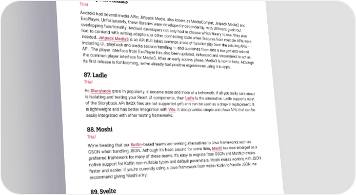 Languages and Frameworks Thoughtworks Technology Radar in IDEs and, ultimately, to produce code that is easier to read and maintain. For teams already using Kotlin, it also means working on the build in a familiar language. We now suggest trialing Kotlin DSL as an alternative language to Groovy for Gradle projects in general, especially if you have large or complex Gradle build scripts. Many IDEs now include support for the migration of existing projects. Some caveats remain, and we suggest checking the documentation for the most up-to-date details, including the prerequisites. We had a team with an at least seven-year-old, 450-line build script migrate successfully within a few days. 86. Jetpack Media3 Trial Android had several media APIs: Jetpack Media, also known as MediaCompat, Jetpack Media2 and ExoPlayer. Unfortunately, these libraries were developed independently, with different goals but overlapping functionality. Android developers not only had to choose which library to use, they also had to contend with writing adaptors or other connecting code when features from multiple APIs were needed. Jetpack Media3 is an API that takes common areas of functionality from the existing APIs — including UI, playback and media session handling — and combines them into a merged and refined API. The player interface from ExoPlayer has also been updated, enhanced and streamlined to act as the common player interface for Media3. After an early access phase, Media3 is now in beta. Although its first release is forthcoming, we’ve already had positive experiences using it in apps. 87. Ladle Trial As Storybook grew in popularity, it became more and more of a behemoth. If all you really care about is isolating and testing your React UI components, then Ladle is the alternative. Ladle supports most of the Storybook API (MDX files are not supported yet) and can be used as a drop-in replacement. It is lightweight and has better integration with Vite. It also provides simple and clean APIs that can be easily integrated with other testing frameworks. 88. Moshi Trial We’re hearing that our Kotlin-based teams are seeking alternatives to Java frameworks such as GSON when handling JSON. Although it’s been around for some time, Moshi has now emerged as a preferred framework for many of these teams. It’s easy to migrate from GSON and Moshi provides native support for Kotlin non-nullable types and default parameters. Moshi makes working with JSON faster and easier. If you’re currently using a Java framework from within Kotlin to handle JSON, we recommend giving Moshi a try. 89. Svelte Trial Among web component frameworks, Svelte stands out by moving reactivity out of the browser and into the compiler. Instead of optimizing DOM updates by using a virtual DOM and browser optimization tricks, Svelte compiles your code into vanilla framework-less JavaScript code that surgically updates the DOM directly. In addition to the run-time performance benefits, this also allows Svelte to optimize © Thoughtworks, Inc. All Rights Reserved. 38