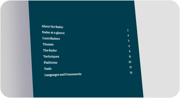 Thoughtworks Technology Radar About the Radar 3 Radar at a glance 4 Contributors 5 Themes 6 The Radar 8 Techniques 11 Platforms 20 Tools 27 Languages and Frameworks 35 © Thoughtworks, Inc. All Rights Reserved.