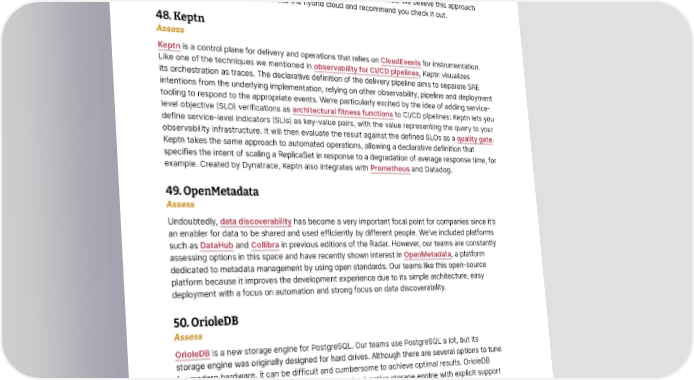 Platforms Thoughtworks Technology Radar 47. IAM Roles Anywhere Assess IAM Roles Anywhere is a new service from AWS that lets you obtain temporary security credentials in IAM for workloads such as servers, containers and applications that run outside of AWS. We find it particularly useful in hybrid cloud setups where workloads are split across AWS and non-AWS resources. Instead of creating long-lived credentials, with IAM Roles Anywhere you can now create short-lived credentials to access AWS resources using X.509 certificates. We believe this approach streamlines the access pattern across the hybrid cloud and recommend you check it out. 48. Keptn Assess Keptn is a control plane for delivery and operations that relies on CloudEvents for instrumentation. Like one of the techniques we mentioned in observability for CI/CD pipelines, Keptn visualizes its orchestration as traces. The declarative definition of the delivery pipeline aims to separate SRE intentions from the underlying implementation, relying on other observability, pipeline and deployment tooling to respond to the appropriate events. We’re particularly excited by the idea of adding service- level objective (SLO) verifications as architectural fitness functions to CI/CD pipelines: Keptn lets you define service-level indicators (SLIs) as key-value pairs, with the value representing the query to your observability infrastructure. It will then evaluate the result against the defined SLOs as a quality gate. Keptn takes the same approach to automated operations, allowing a declarative definition that specifies the intent of scaling a ReplicaSet in response to a degradation of average response time, for example. Created by Dynatrace, Keptn also integrates with Prometheus and Datadog. 49. OpenMetadata Assess Undoubtedly, data discoverability has become a very important focal point for companies since it’s an enabler for data to be shared and used efficiently by different people. We’ve included platforms such as DataHub and Collibra in previous editions of the Radar. However, our teams are constantly assessing options in this space and have recently shown interest in OpenMetadata, a platform dedicated to metadata management by using open standards. Our teams like this open-source platform because it improves the development experience due to its simple architecture, easy deployment with a focus on automation and strong focus on data discoverability. 50. OrioleDB Assess OrioleDB is a new storage engine for PostgreSQL. Our teams use PostgreSQL a lot, but its storage engine was originally designed for hard drives. Although there are several options to tune for modern hardware, it can be difficult and cumbersome to achieve optimal results. OrioleDB addresses these challenges by implementing a cloud-native storage engine with explicit support for solid-state drives (SSDs) and nonvolatile random-access memory (NVRAM). To try the new engine, first install the enhancement patches to the current table access methods and then install OrioleDB as a PostgreSQL extension. We believe OrioleDB has great potential to address several long-pending issues in PostgreSQL, and we encourage you to carefully assess it. © Thoughtworks, Inc. All Rights Reserved. 26